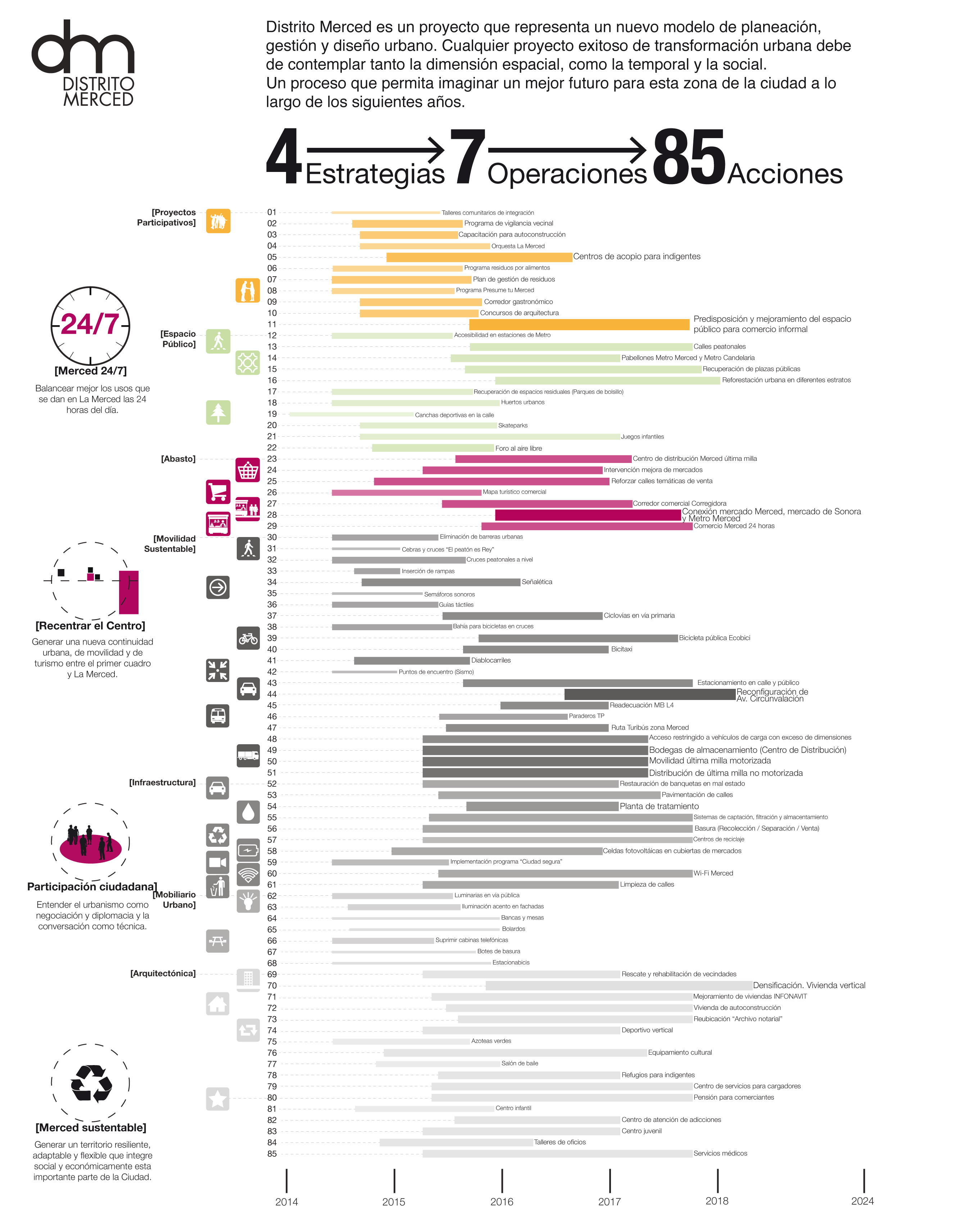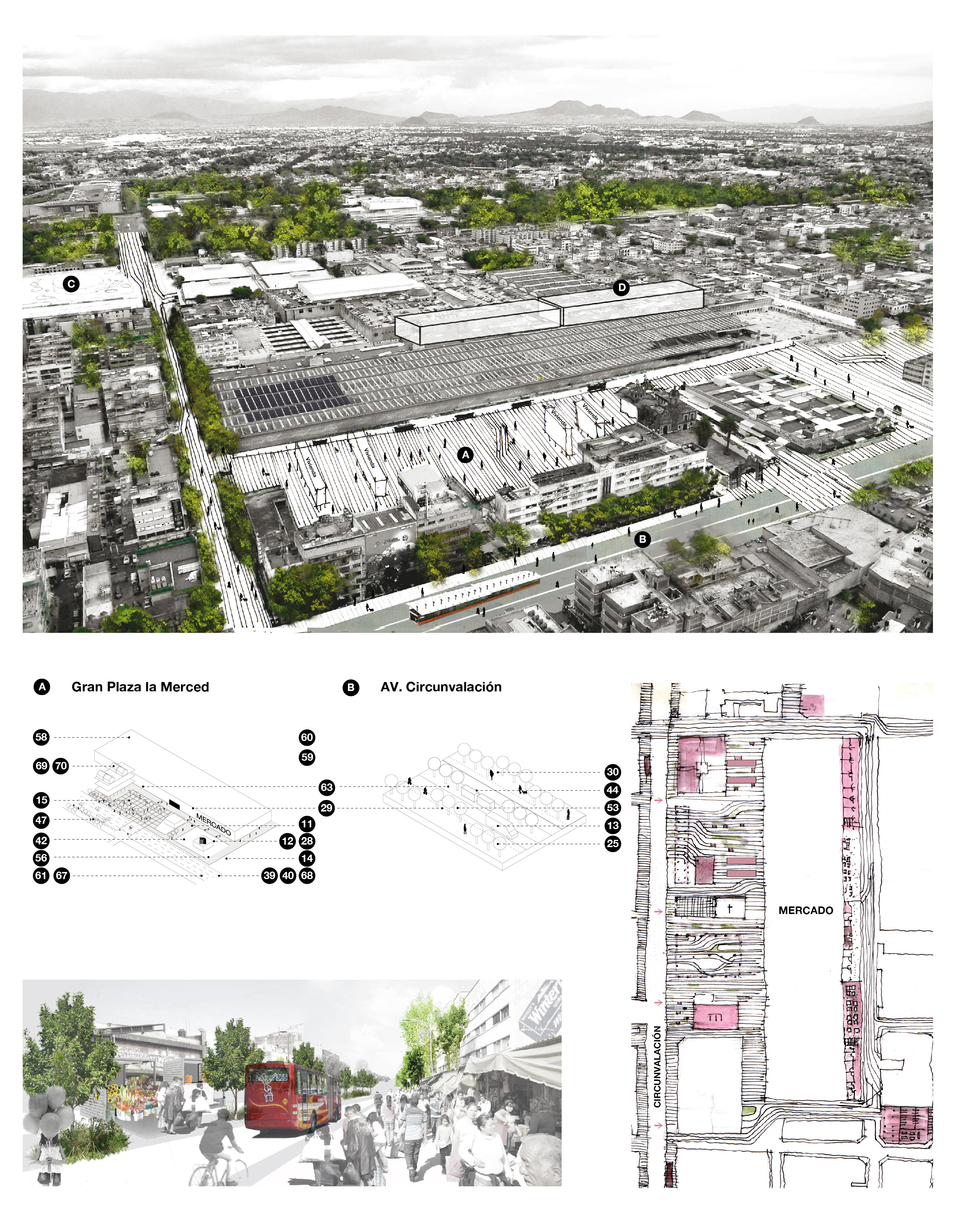 Desarrollada en el marco de un concurso, la propuesta para Distrito Merced reimaginó las calles como espacios públicos activos, transformando profundamente la manera de entender la movilidad y la vida urbana en la zona. El proyecto se convirtió en la base conceptual y estratégica para iniciativas posteriores en el distrito, incluyendo el Mercado de San Juan Pugibet, y demostró su capacidad de articular múltiples intervenciones bajo una visión compartida del espacio público y la conectividad urbana que redefine las prioridades del diseño.